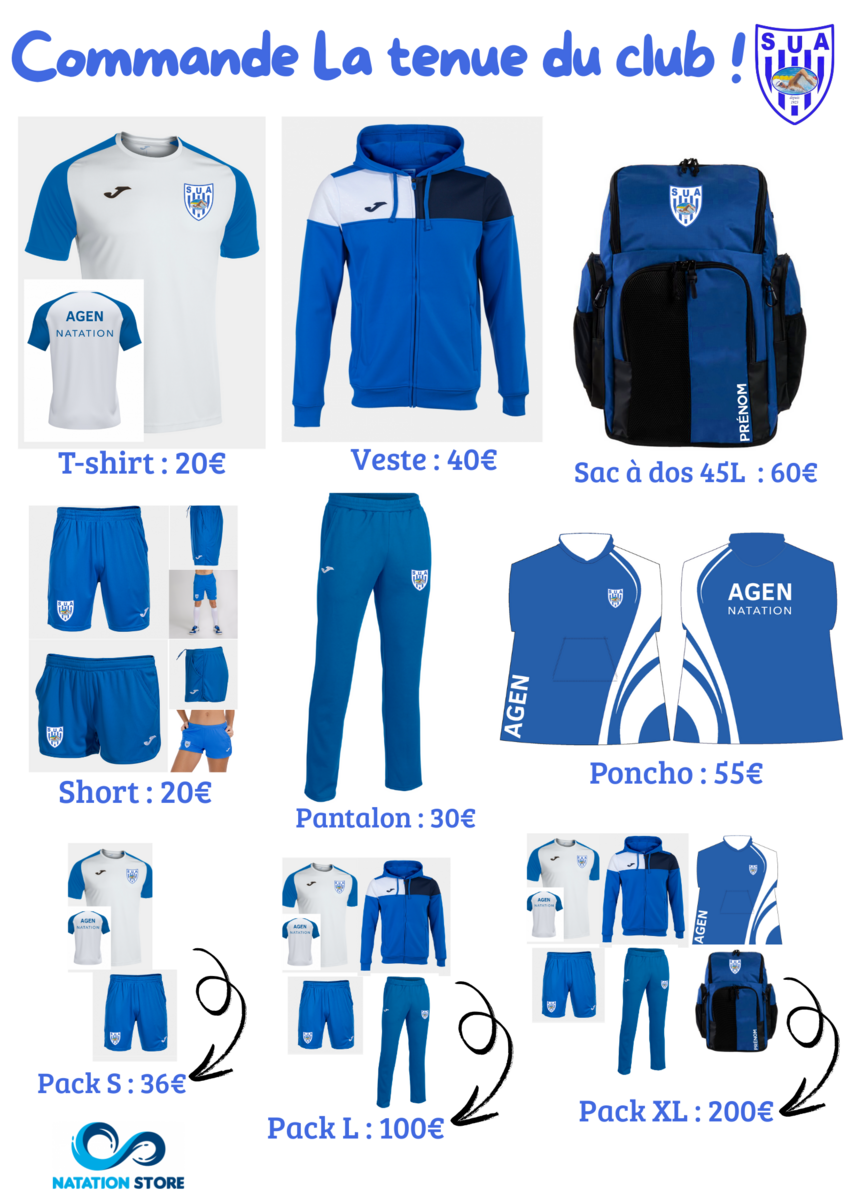Vous pouvez commander la tenues directement sur le site du club.Ou nous retourner le bon de commande rempli avec le paiement (chèque à l’ordre du SUA Natation ou espèces).